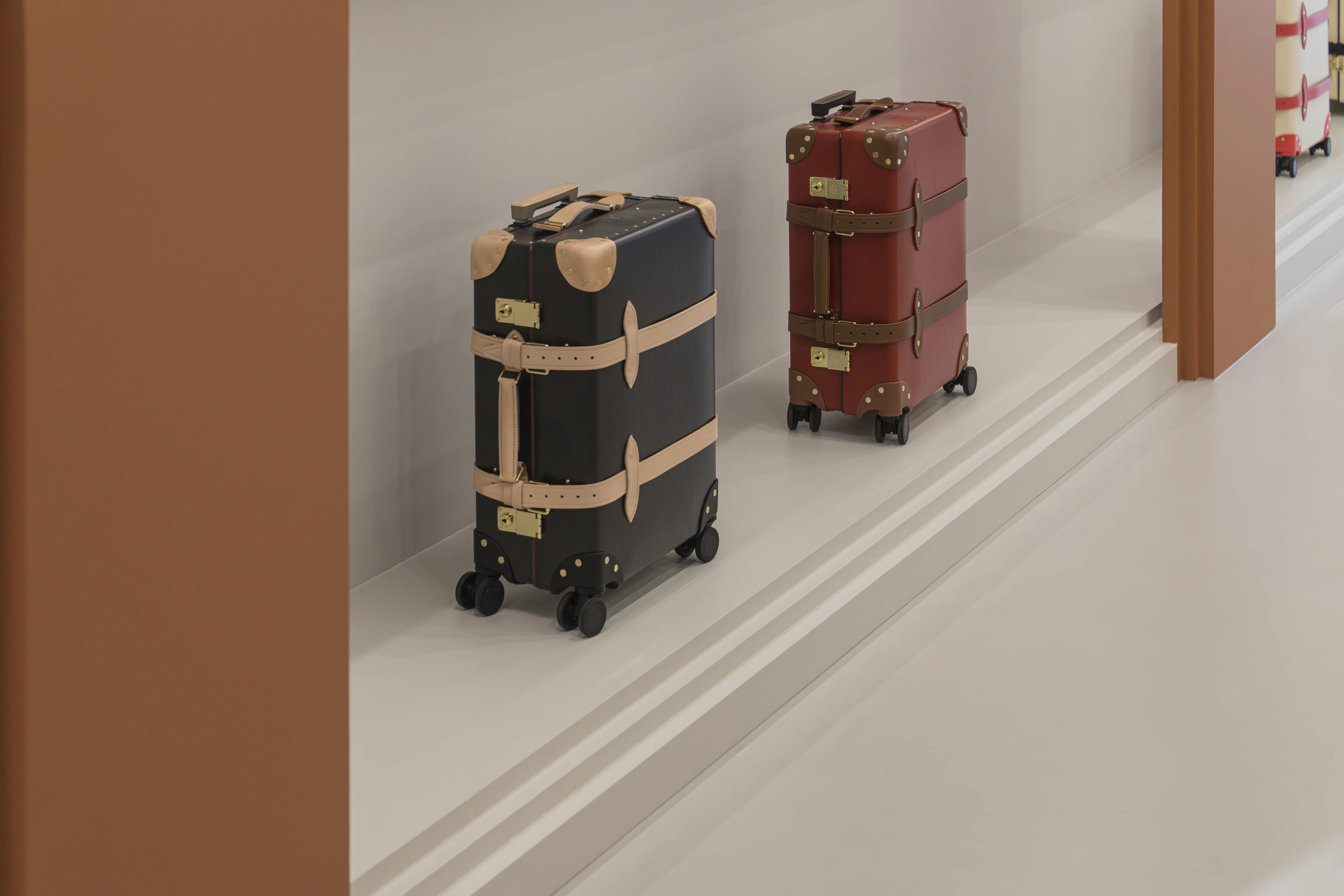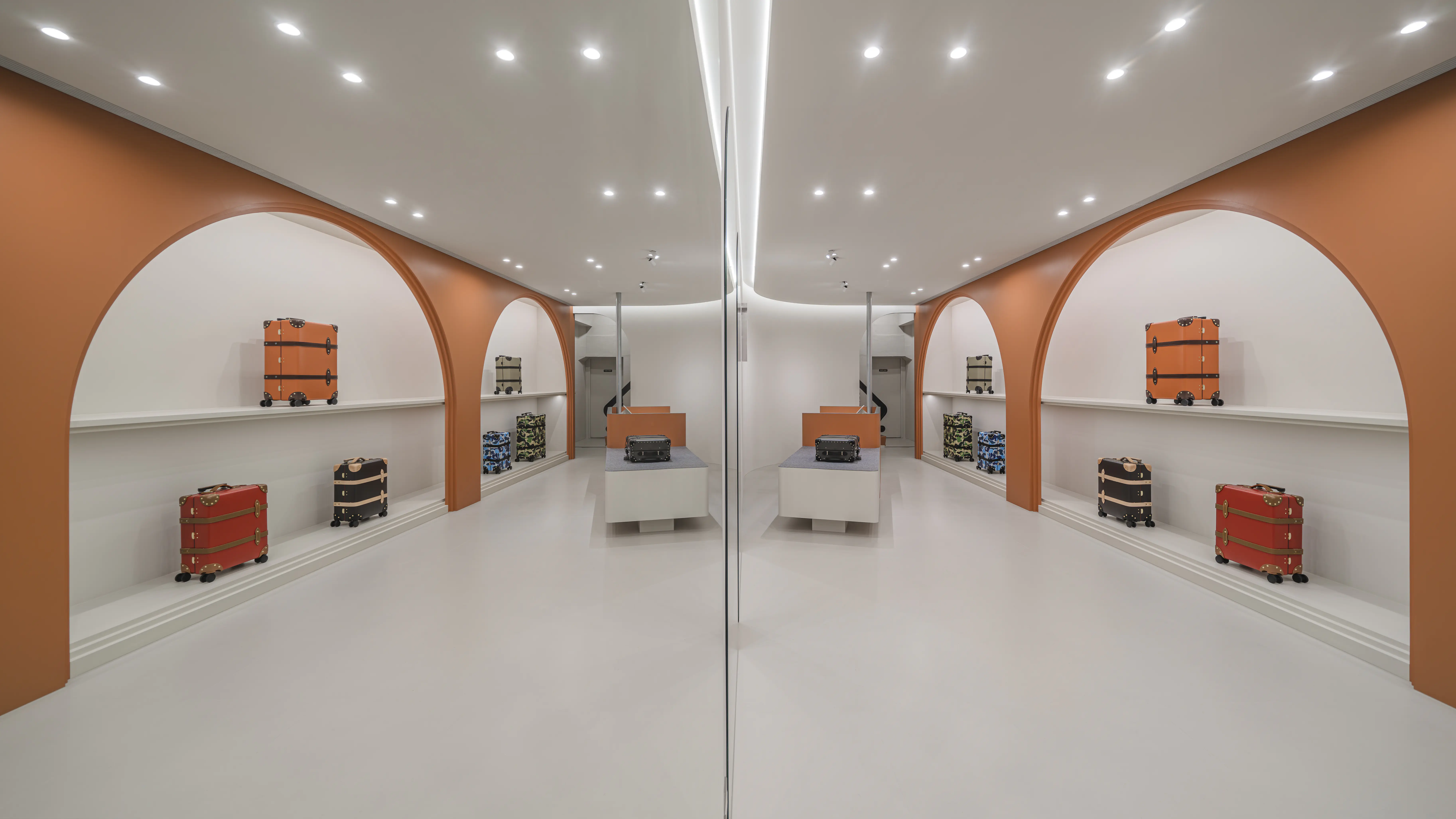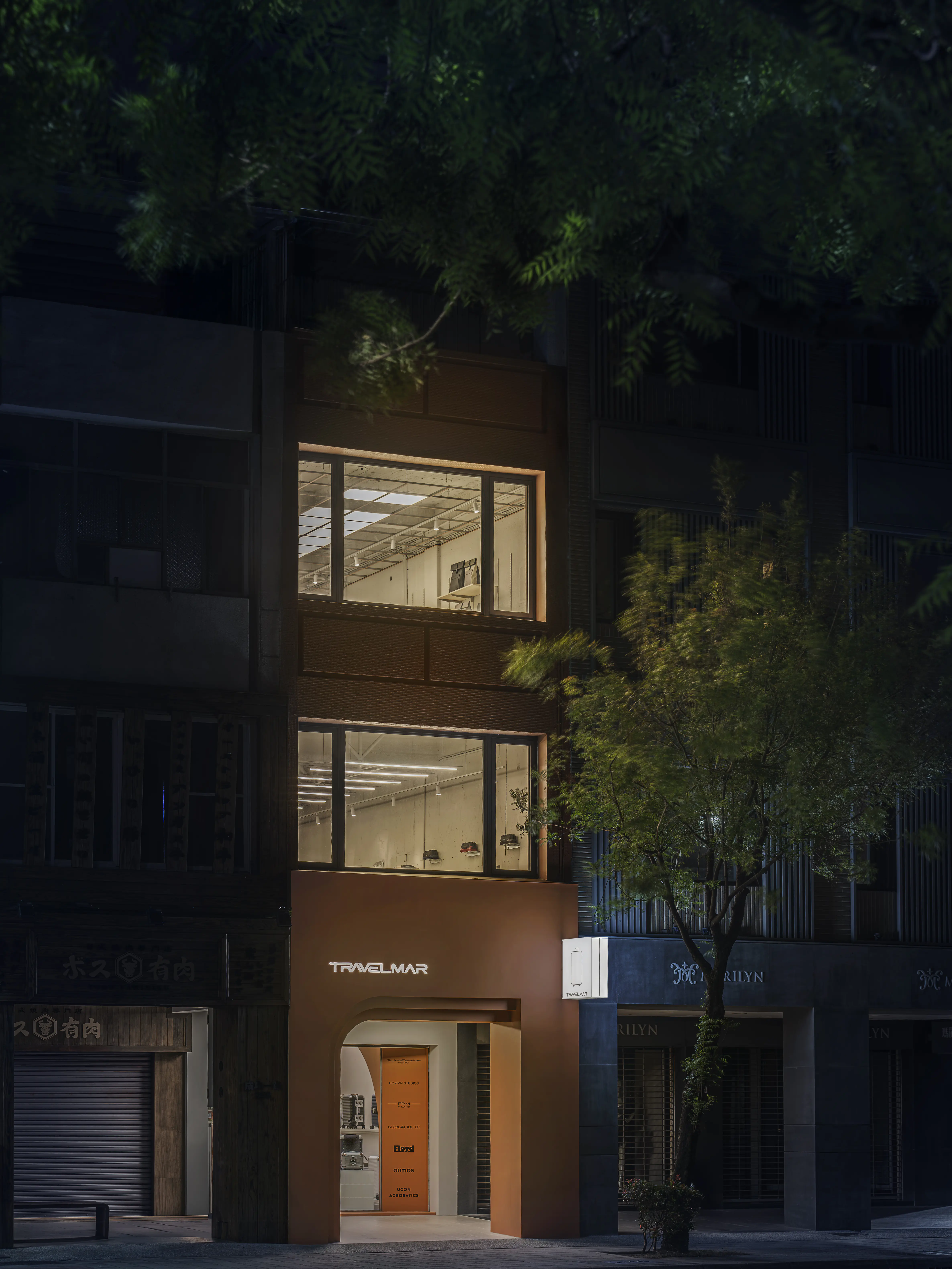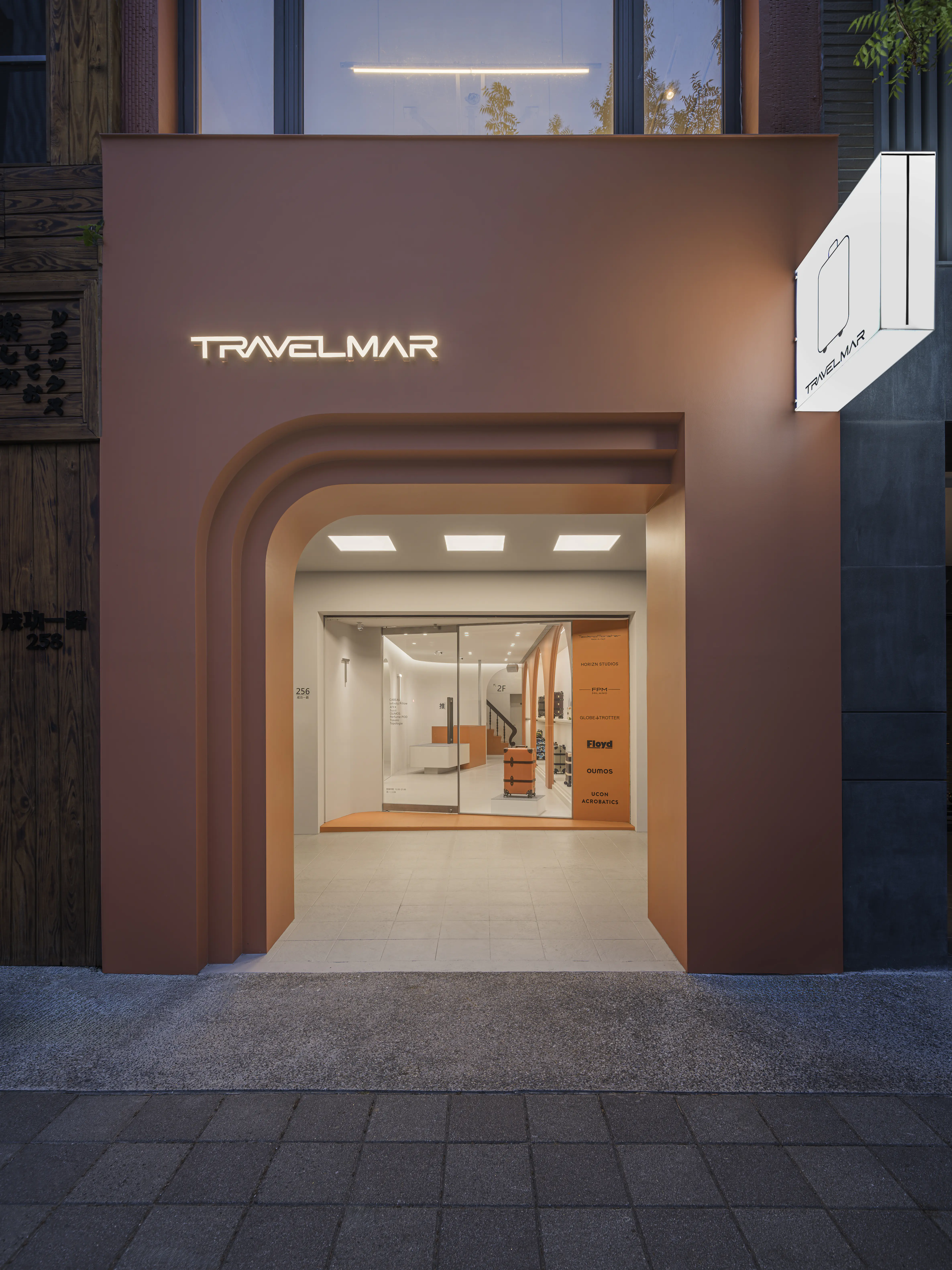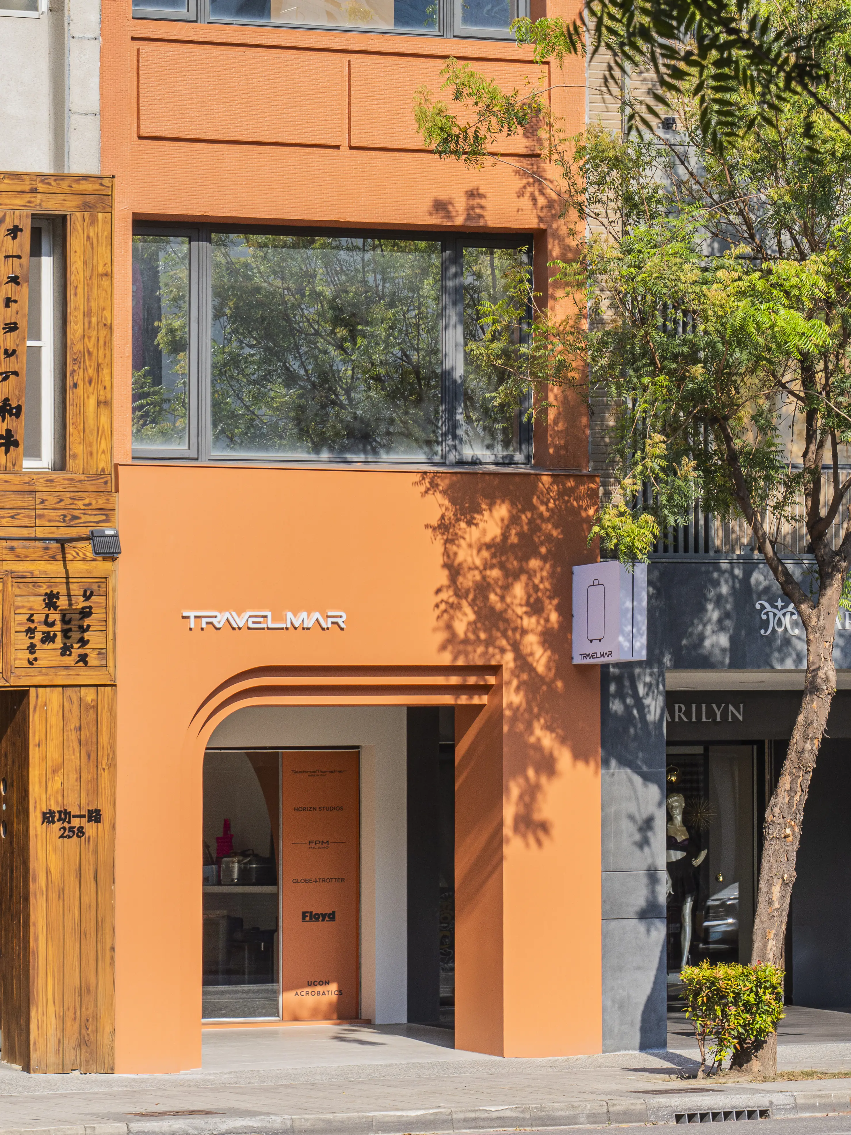 創立於1897年的英國手工行李箱品牌 Globe-Trotter,以硬紙纖維板打造堅固卻輕盈的經典,延續百年製作工藝,成為旅行黃金時代的象徵。位於高雄前金區的 Travelmar 以 Globe-Trotter 為展售主體,設計靈感取自品牌標誌性的弧線與圓拱語彙,在多品牌並存的場域中梳理主次,也回應在地脈絡。
