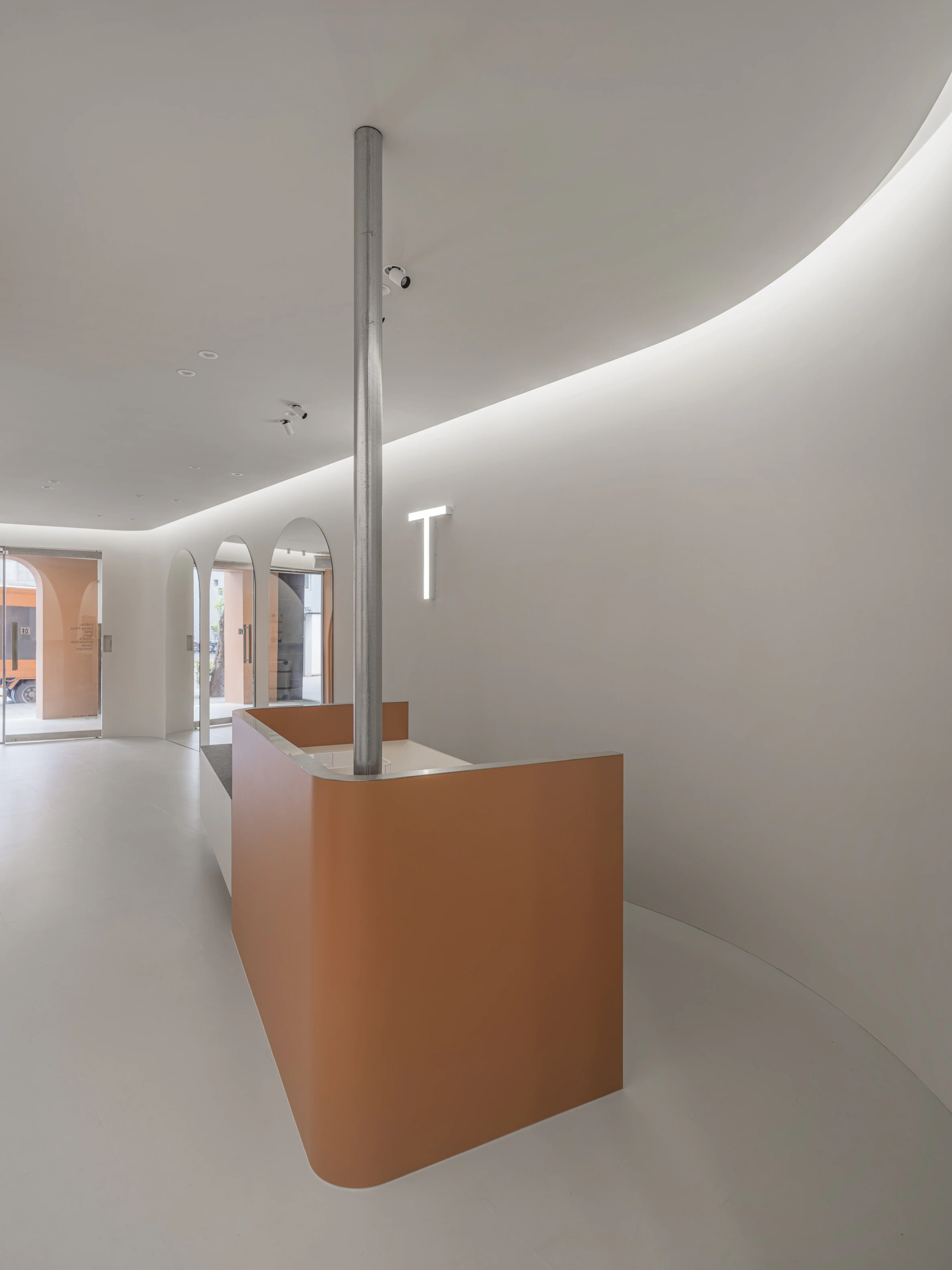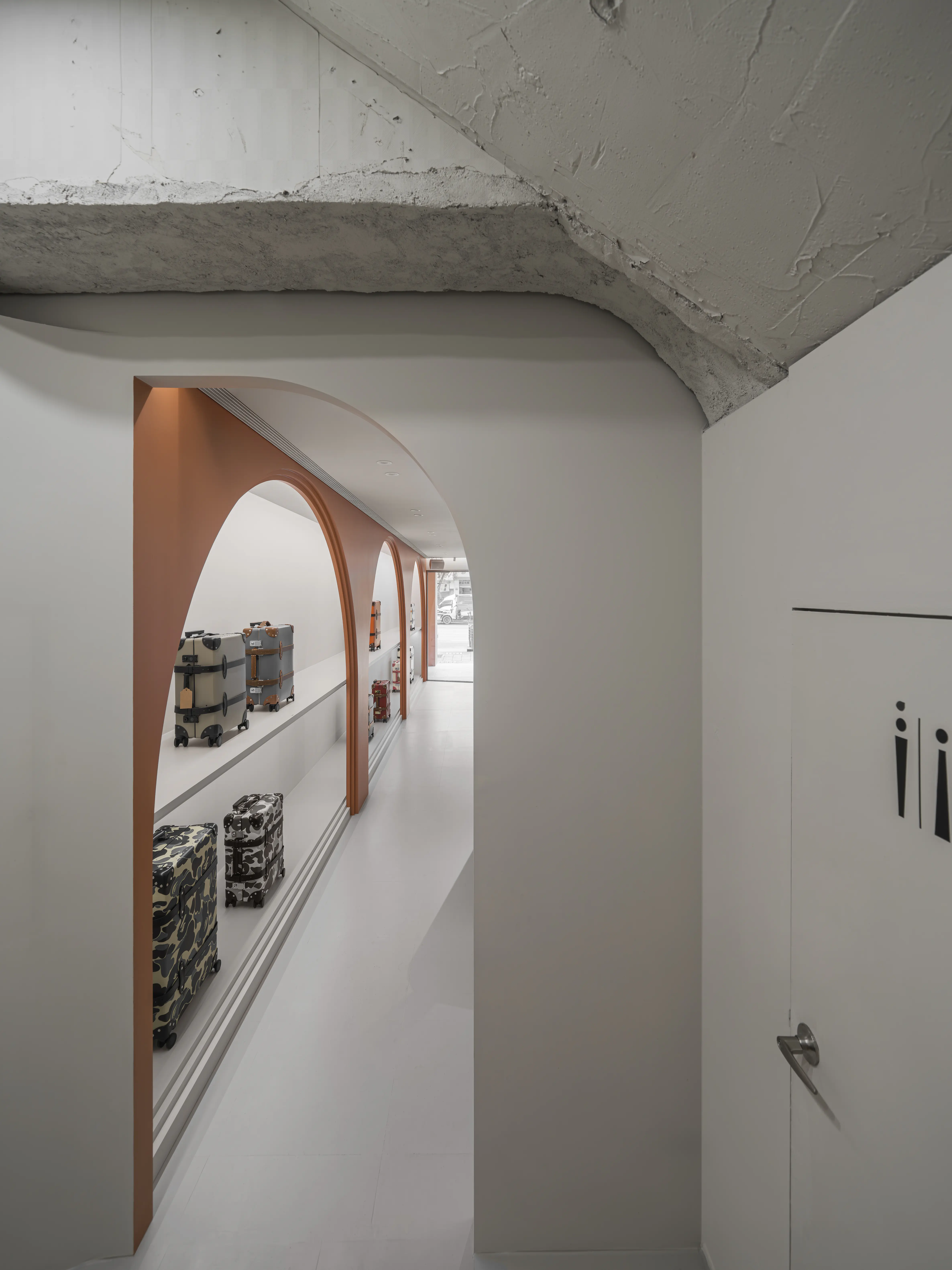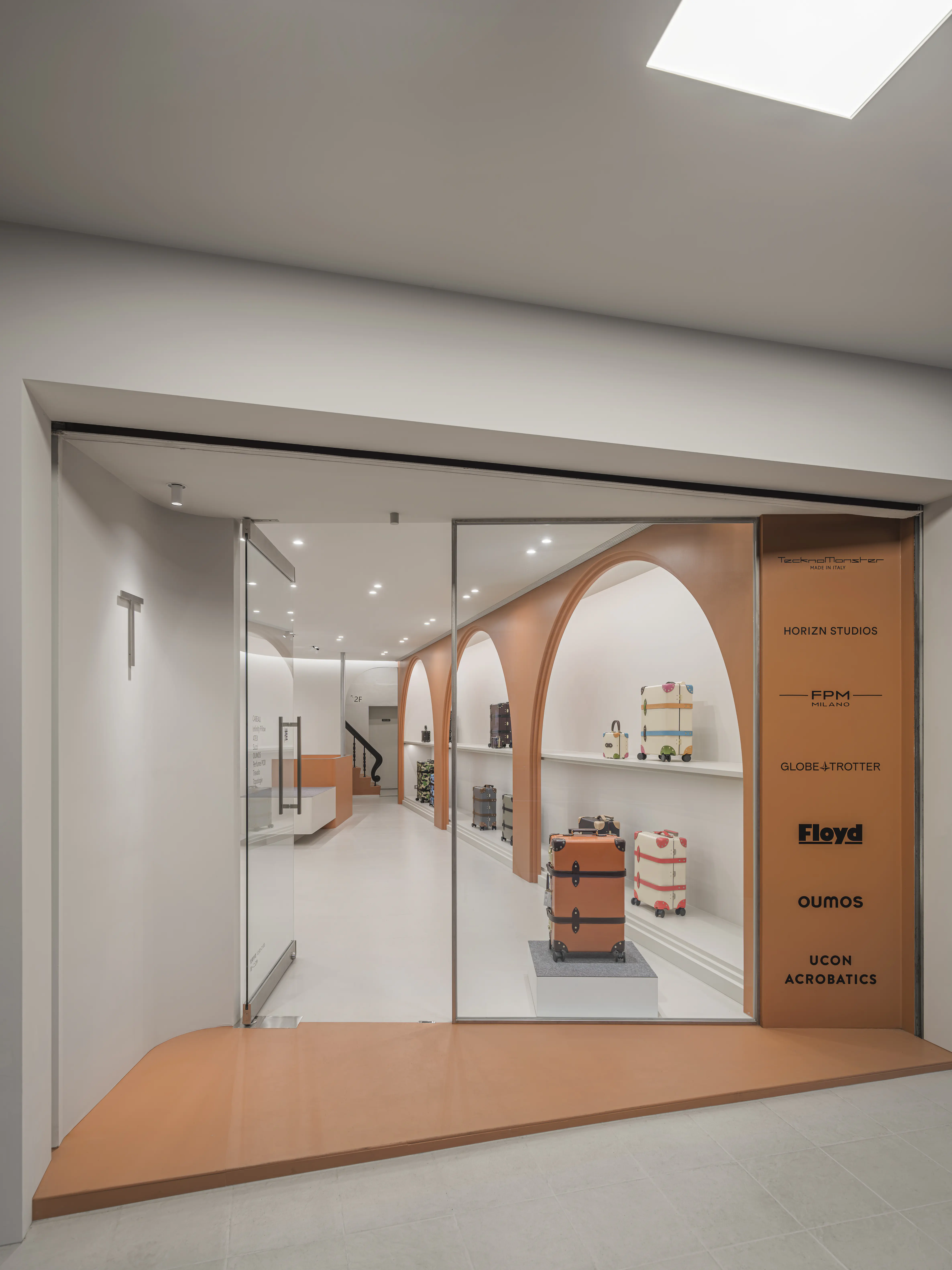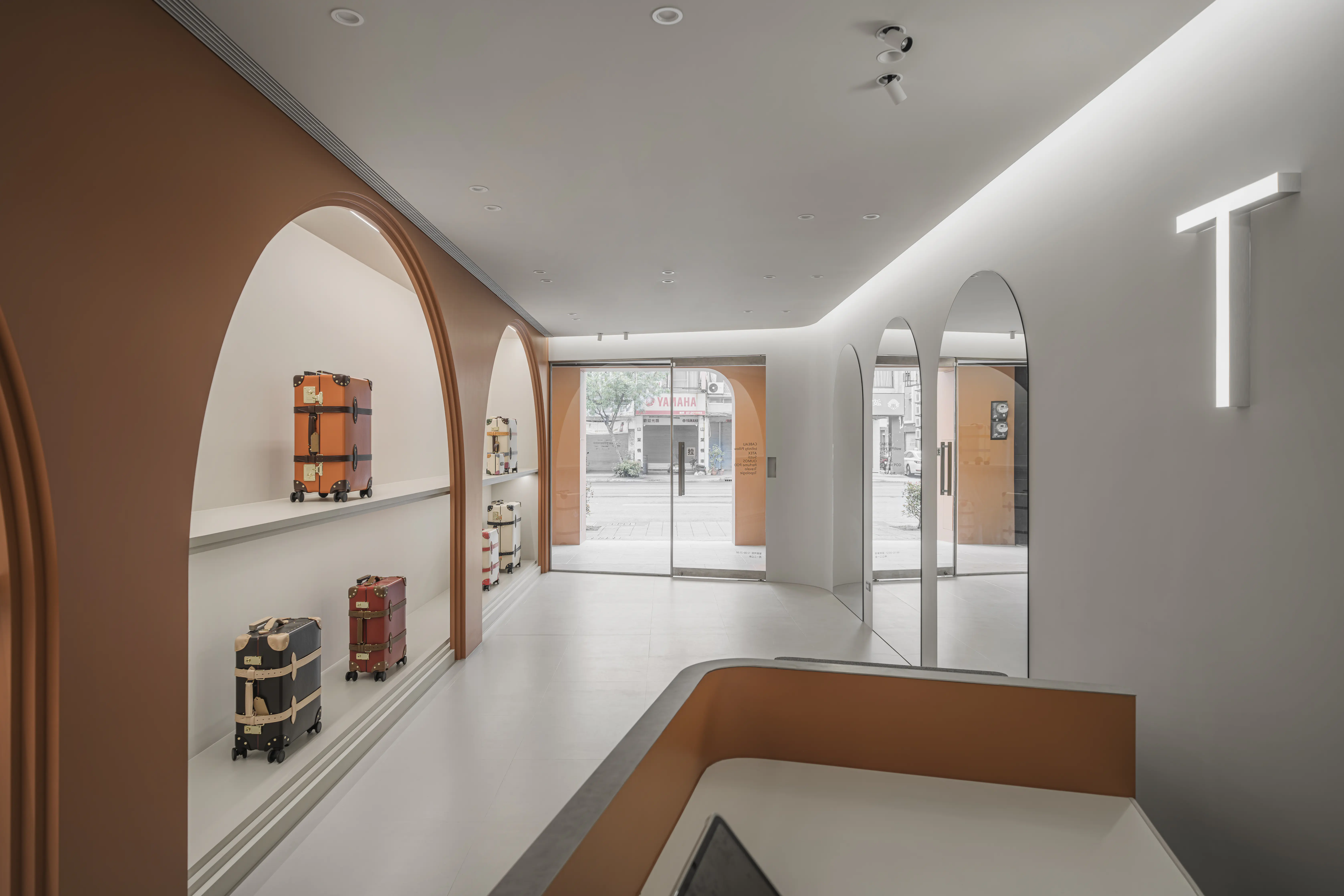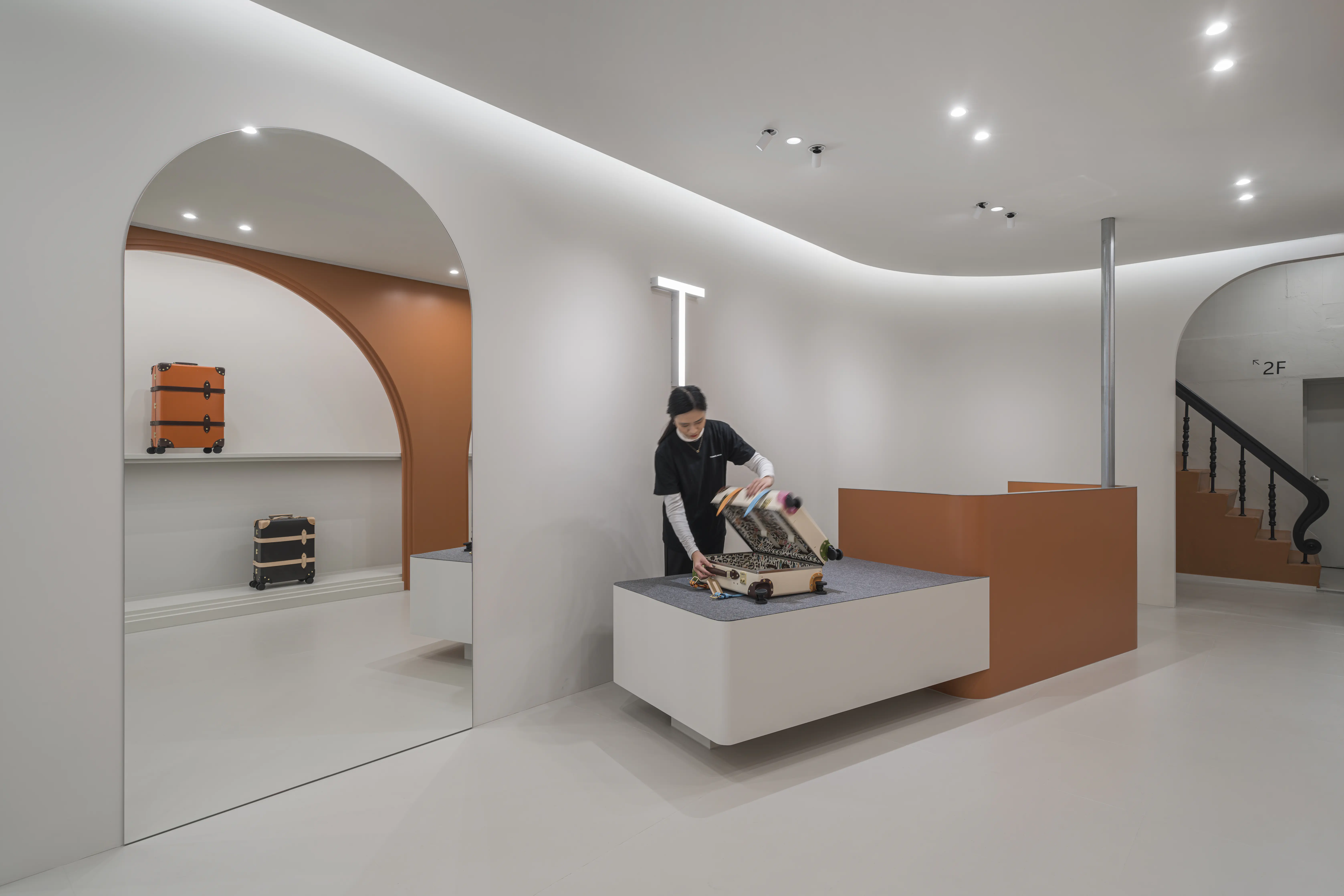 街邊店設計以紅磚色為主軸,將立面微幅內縮形成斜角空間,讓行人行經時在餘光中捕捉層次變化。行李箱標誌性的拱形與四分之一圓語彙融入門面與細節,使立面在整排騎樓中格外鮮明。地坪與色彩向內延伸,引導視線至斜角櫃檯與後方樓梯,形成一條斜線軸線;主體色則沿梯間貫穿至三樓,如同自入口啟航的旅程動線。