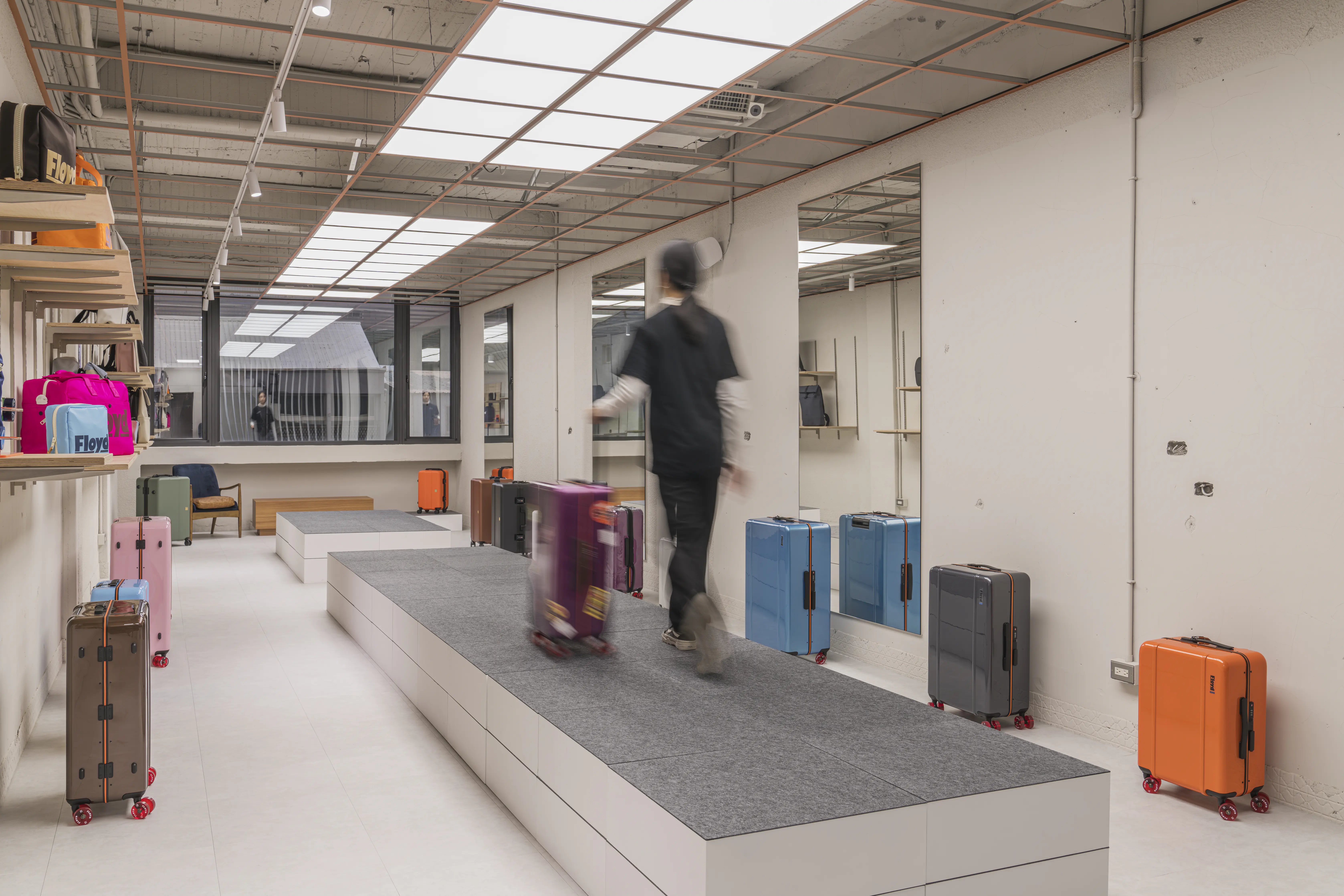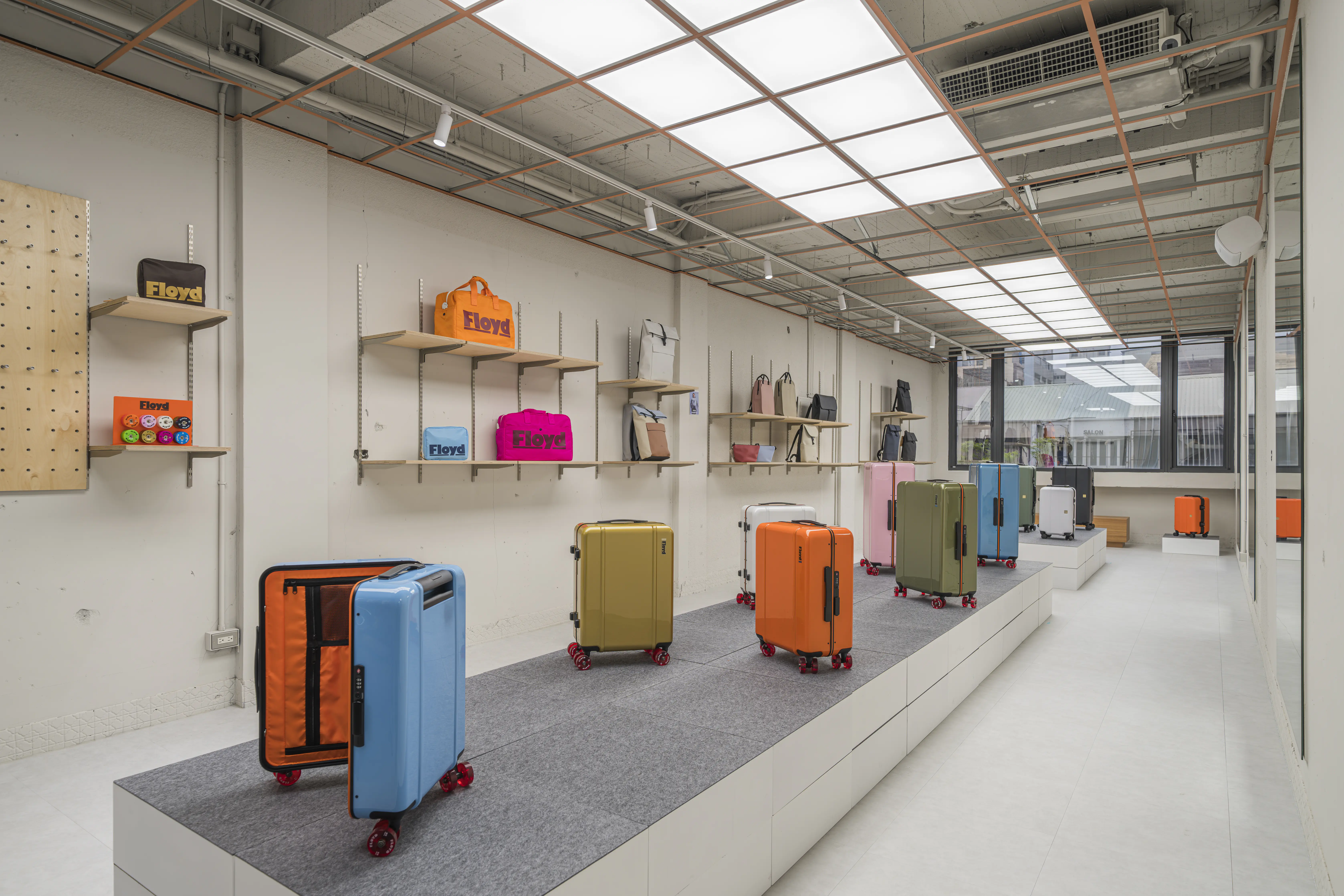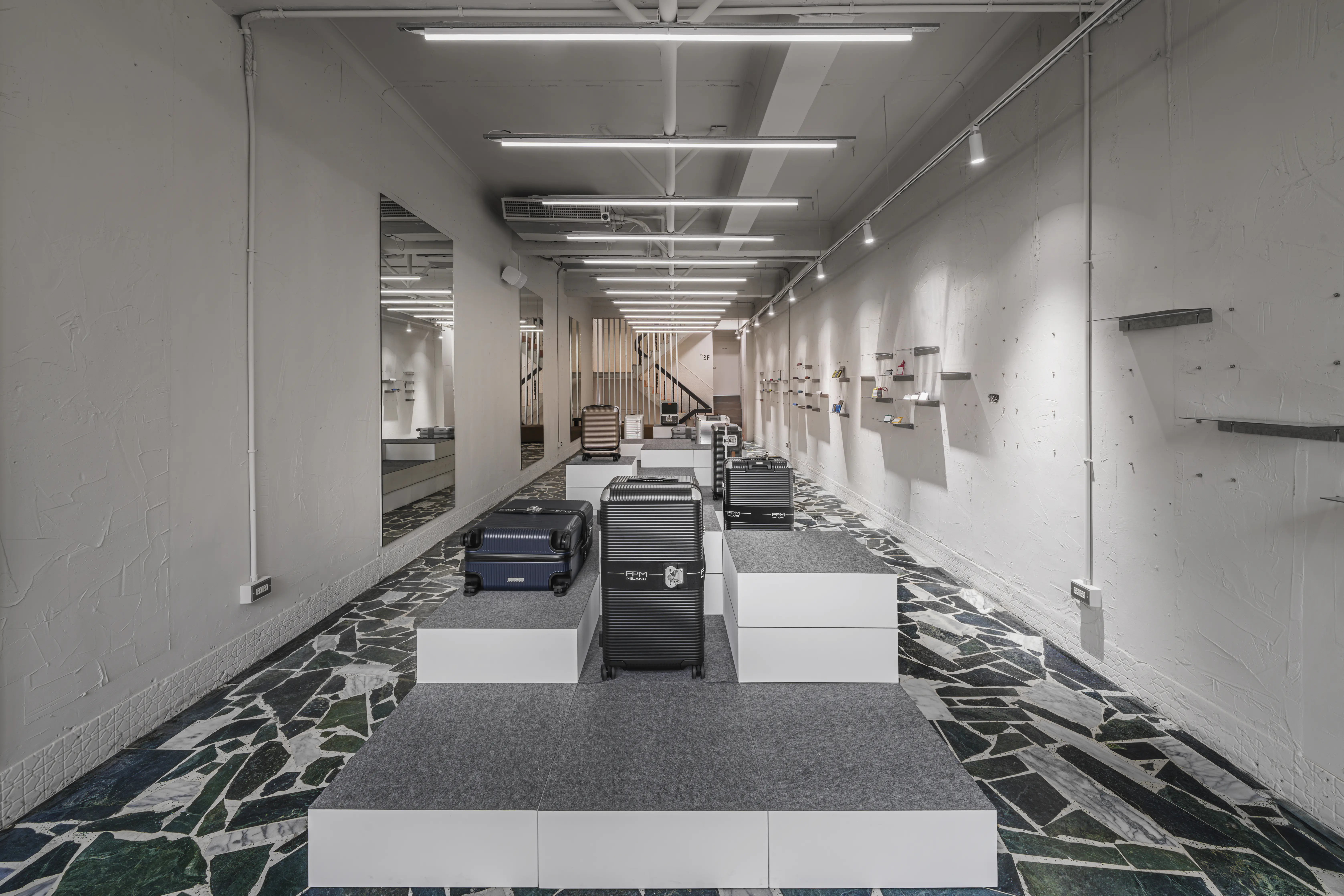 二、三樓回歸共享概念,為多品牌提供平等且彈性的展示平台。牆面與層板採用輕隔間骨料、鍍鋅板等原始材質回收再利用,並搭配不同木質元素,與實木合板行李箱形成材質對話,傳遞永續理念。針對基地後段採光不足,設計拆除隔間並打開樓梯旁牆面,引入三樓自然光層層漫射。從地面展台到牆面層板,空間以垂直堆疊與可調模組回應城市向上生長的意象,錯位與變化打破僵直排列,讓視線在高低與方向間流動。