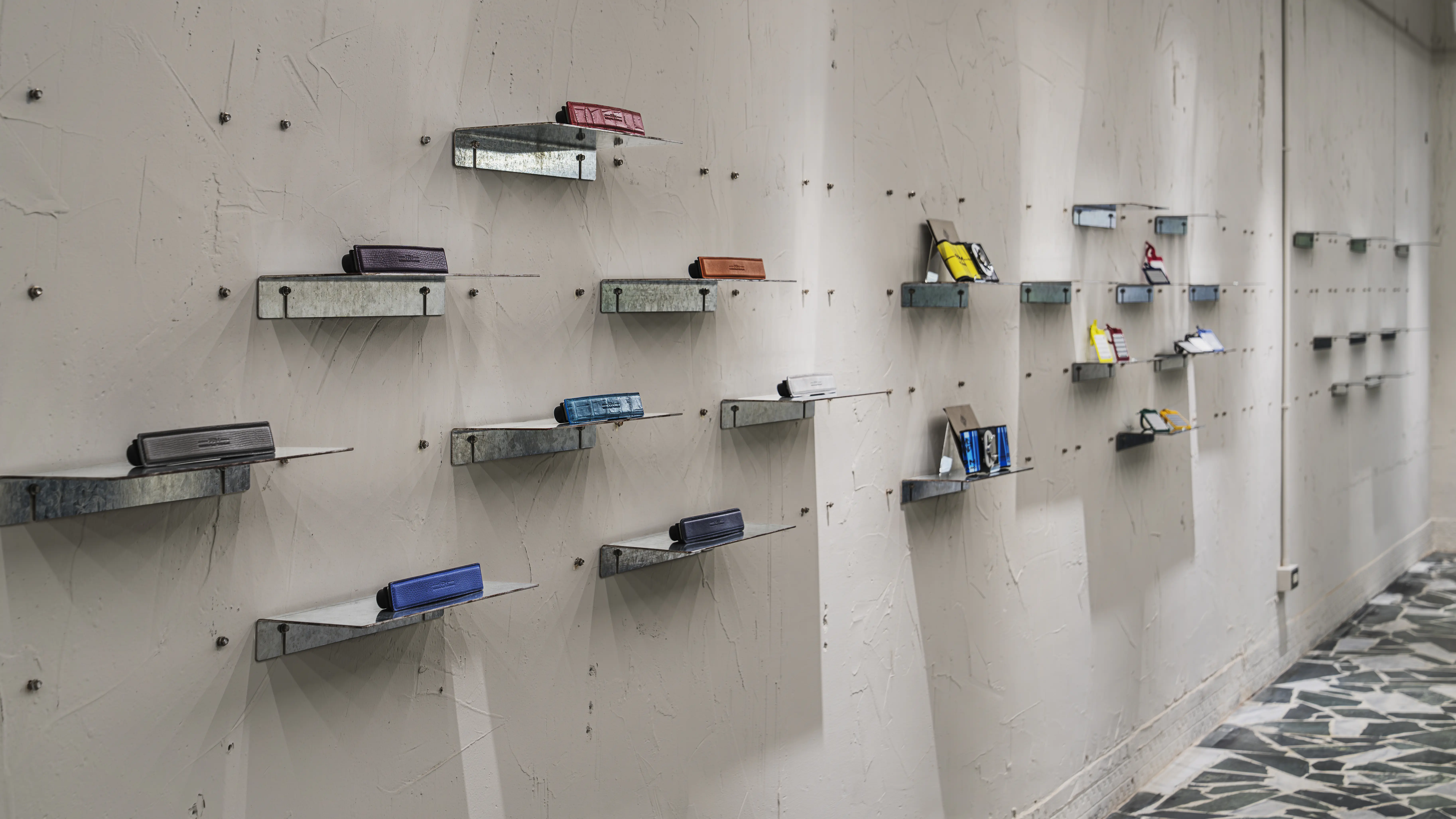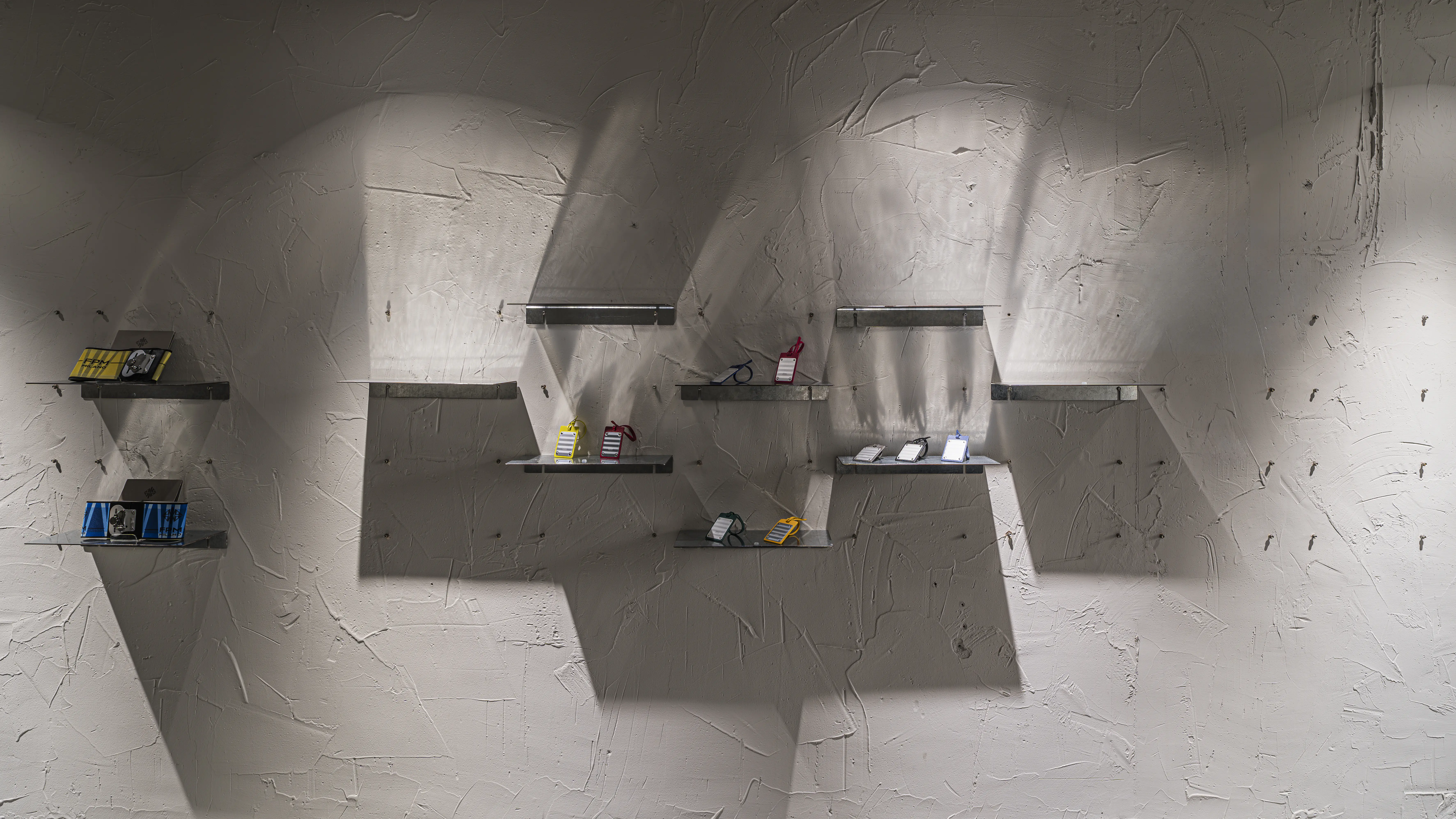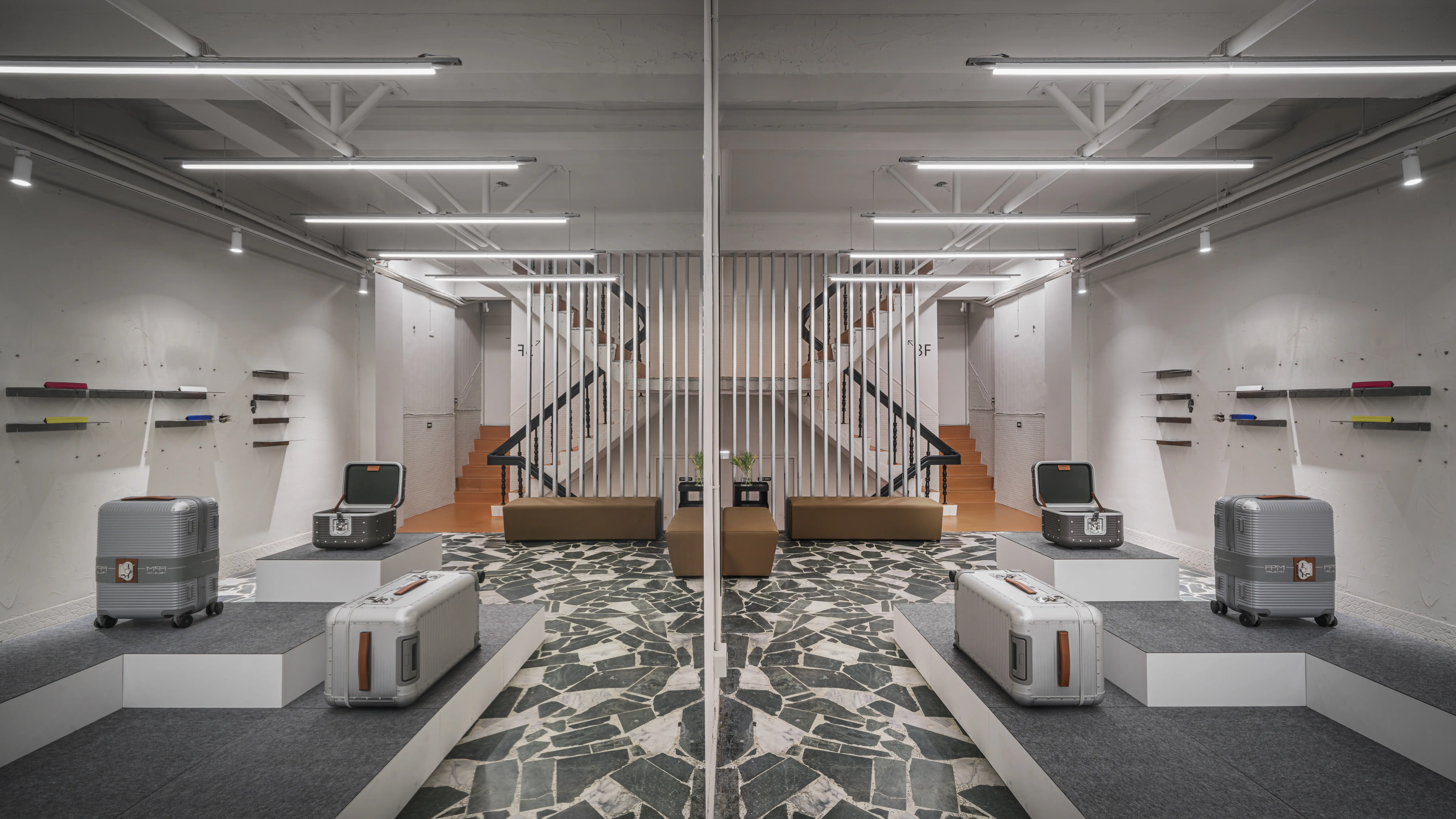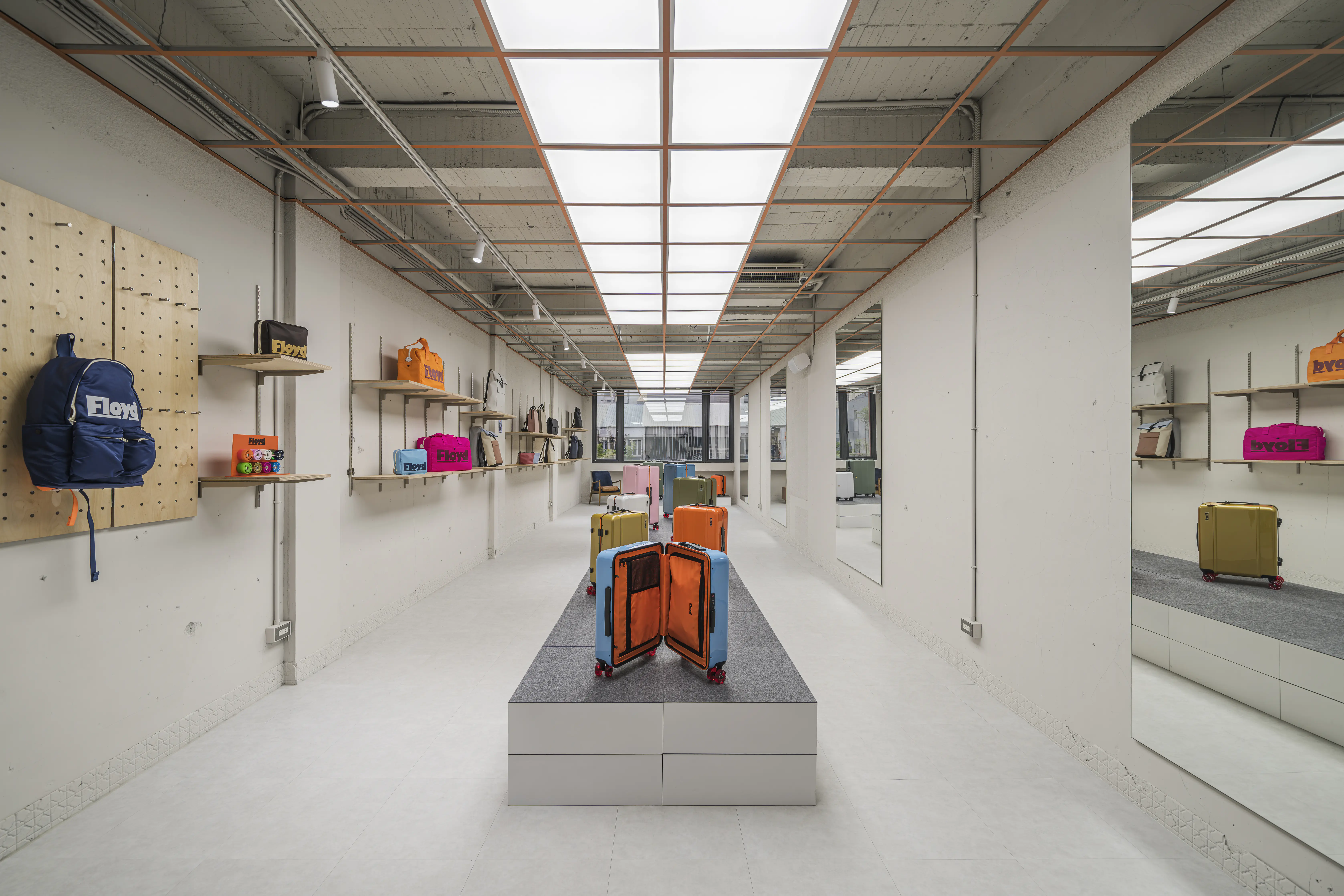二、三樓回歸共享概念,為多品牌提供平等且彈性的展示平台。牆面與層板採用輕隔間骨料、鍍鋅板等原始材質回收再利用,並搭配不同木質元素,與實木合板行李箱形成材質對話,傳遞永續理念。針對基地後段採光不足,設計拆除隔間並打開樓梯旁牆面,引入三樓自然光層層漫射。從地面展台到牆面層板,空間以垂直堆疊與可調模組回應城市向上生長的意象,錯位與變化打破僵直排列,讓視線在高低與方向間流動。
